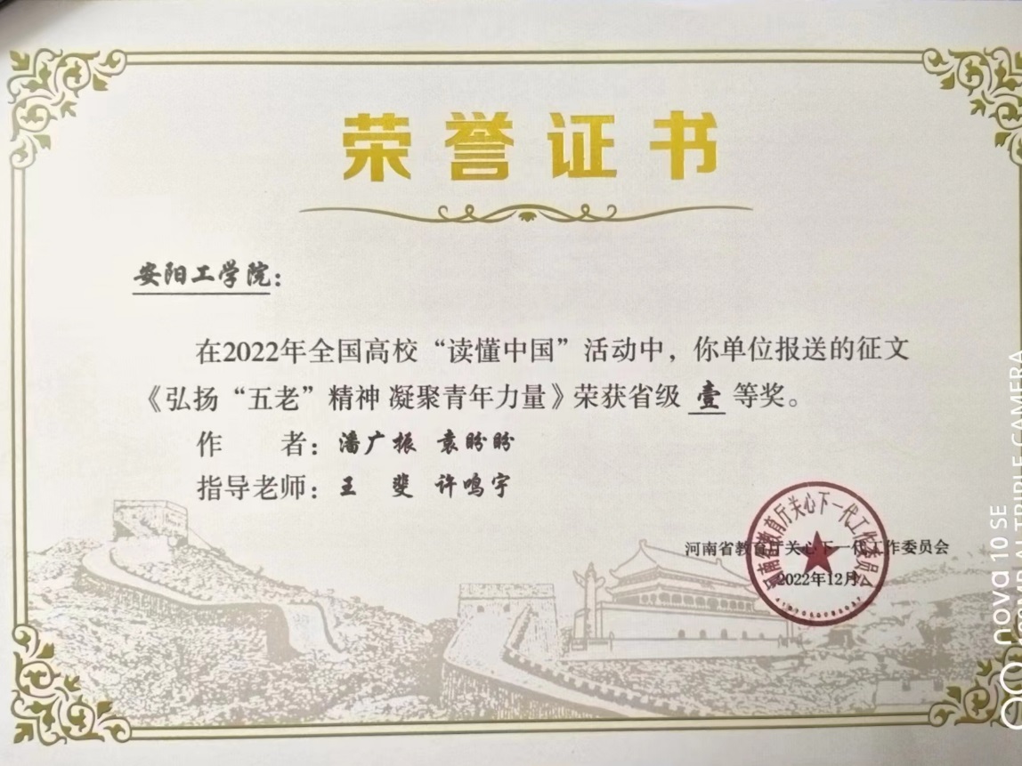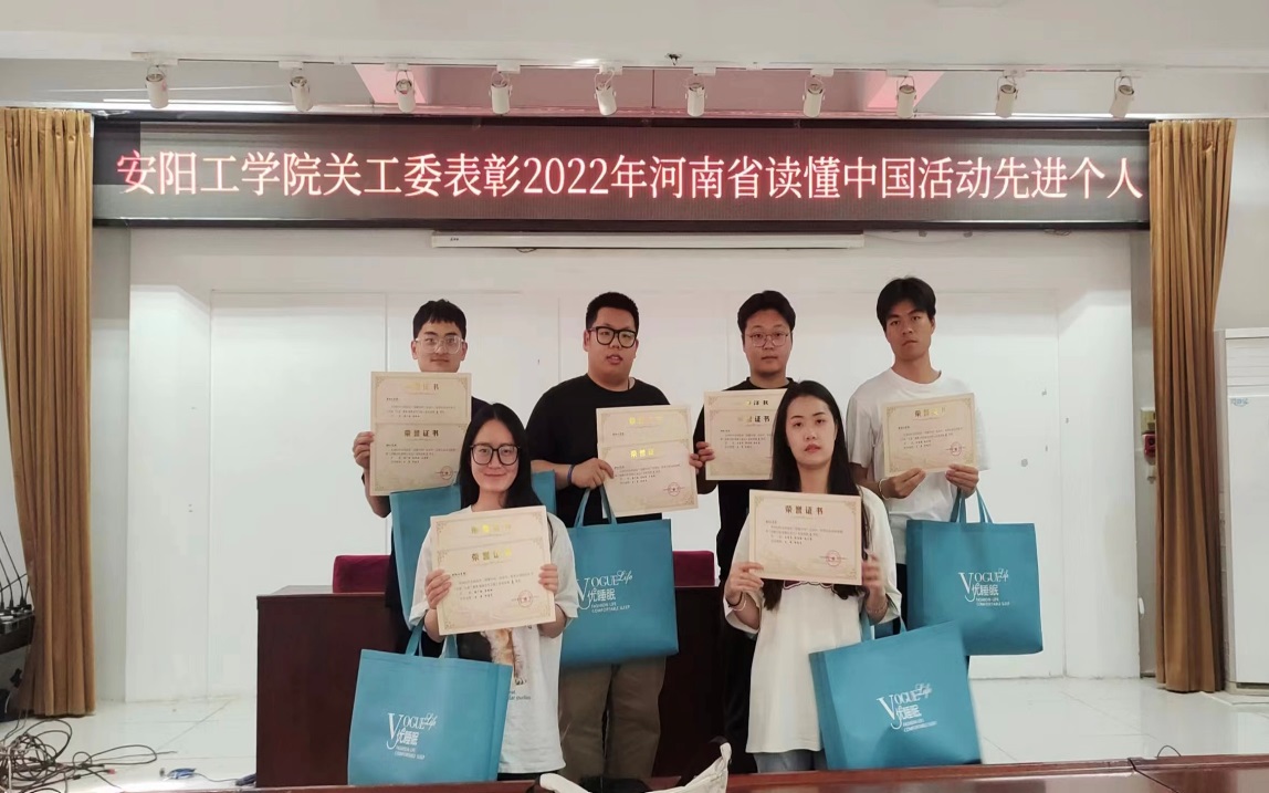 会上,首先宣读了在2022年我校参加读懂中国活动中获奖情况,6名学生参与创作的5个作品全部获奖,其中潘子振、袁盼盼创作的《弘扬“五老”精神 凝聚青年力量》征文荣获省一等奖;其余作品均获二等奖。其次向取得优异成绩的学生颁发荣誉证书和奖品。