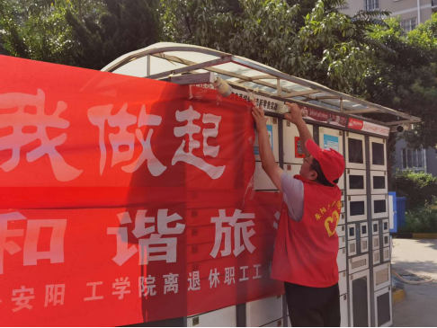 党员志愿者粘贴文明宣传条幅