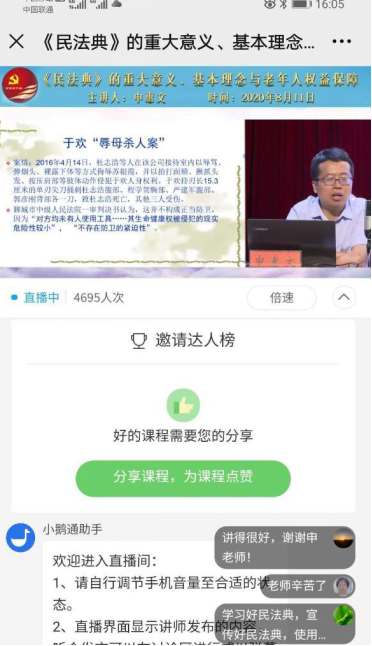 本次在线报告会由邀请郑州大学法学院副教授、河南省法学会民法学研究会秘书长申惠文作辅导报告,专题解读《中华人民共和国民法典》。《中华人民共和国民法典》是新中国成立以来第一部以“法典”命名的法律,被誉为“社会生活的百科全书”。申惠文用通俗易懂的语言、生动鲜活的案例,深入浅出地解读了《中华人民共和国民法典》的深远意义、时代创新、亮点特色等,全方位诠释了《中华人民共和国民法典》鲜明的中国特色、实践特色、时代特色。