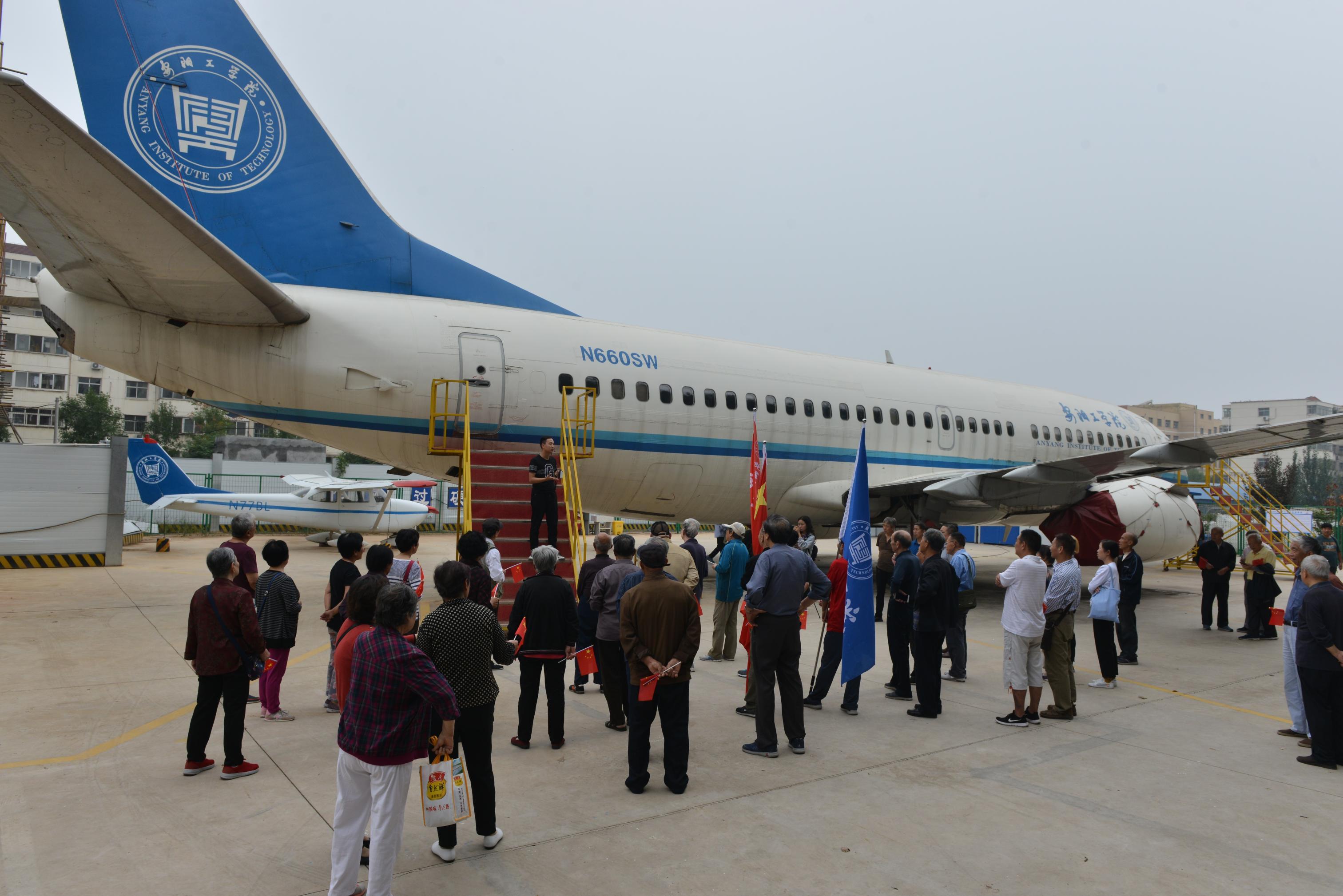 在飞行学院航空实训中心,栗立峰博士向老同志仔细讲解了飞机采购、教学实训等情况,大家为学校的特色办学感到自豪和骄傲,并纷纷登上波音737-300飞机拍照留影。