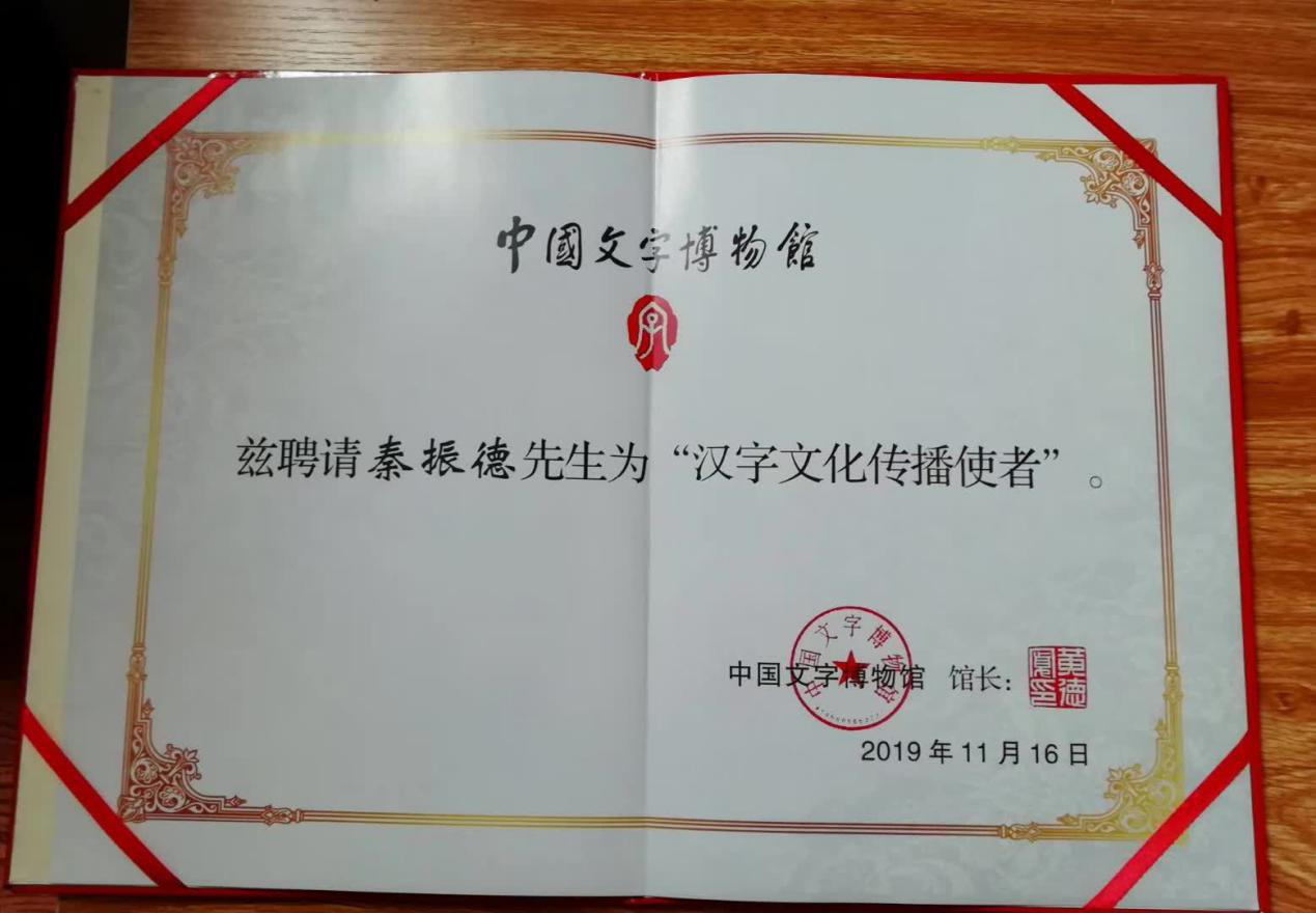 近日获悉,在第三届“汉字文化传播奖”评选中,我校退休教师、现中国文字博物馆英文讲解员志愿者秦振德受聘为“汉字文化传播使者”。